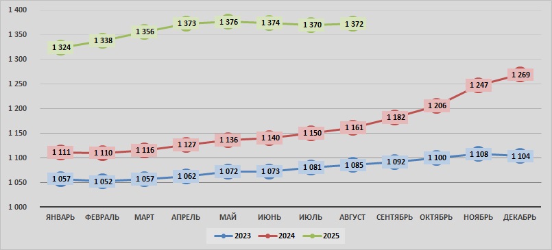 В августе 2025г рыба лососевых пород в России* стоила в среднем 1 372 руб./кг - на 0,1% больше, чем в предыдущем месяце, и на 18,2% больше, чем в августе 2024г. С начала года цена выросла на 3,6%.
