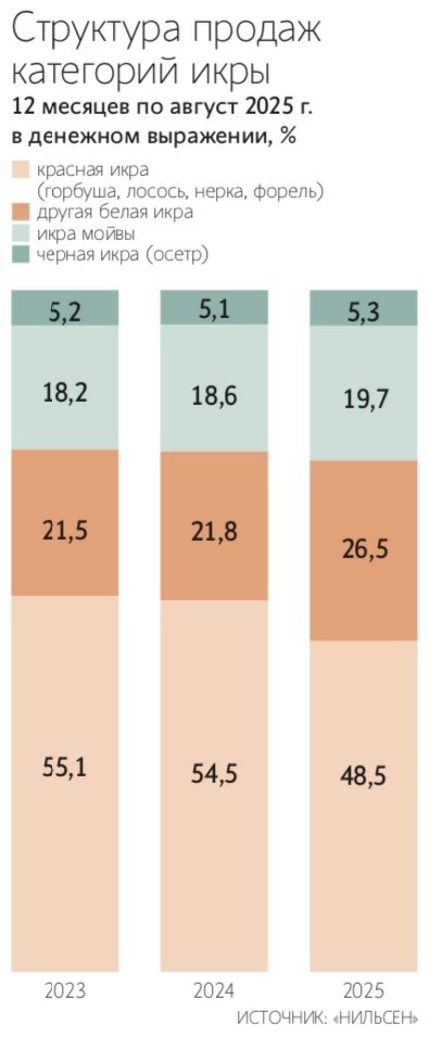 Стоимость и качество красной икры возвращаются к «нормальному состоянию», указывает президент Всероссийской ассоциации рыбопромышленников Герман Зверев. По его словам, в нулевые – десятые годы временное сочетание рекордных выловов лососевых, наличия браконьерской и нелегальной продукции и сравнительной безопасности применения схем ухода от НДС привели к обвалу цен на этот товар и снижению его качества. Но в результате доля красной икры в общем объеме такого товара снизилась. По данным «Нильсена», за год, закончившийся в августе 2025 г., она сократилась год к году на 6 п. п. до 48,5% в деньгах.