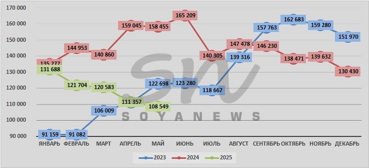 За период с января 2023г. минимальная цена на рыбную муку была зафиксирована в феврале 2023г. - 91,1 тыс.руб./т, отмечает SoyaNews. Максимальной ценой за данный период стала цена июня 2024 года - 165,2 тыс.руб./т.