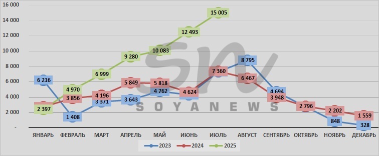 За период с января 2023г. максимальный объём производства комбикормов для рыб был достигнут в июле 2025г. (15 005 тонн), уточняет SoyaNews. Минимальным стал объём производства декабря 2023г. - 328 тонн.