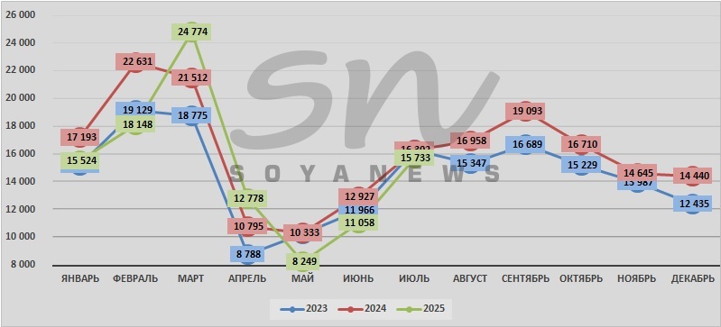 За период с января 2023г. минимальный объём производства рыбной муки зафиксирован в мае 2025г.: 8,2 тыс.тонн, отмечает SoyaNews; максимальный - в марте 2025г.: 24,8 тыс.тонн.