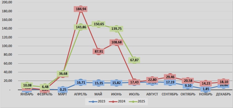 В июле 2025г. в России** произведено 67,87 тонны морской рыбы - в 2,06 раза меньше, чем в предыдущем месяце, но в 3,89 раза больше, чем в июле 2024г.