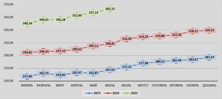 В июне 2025г. рыба в России* стоила в среднем 363,15 руб./кг - на 1,7% больше, чем месяцем ранее, и на 17,6% больше, чем в июне 2024 года. С начала года цена выросла на 6,7%.