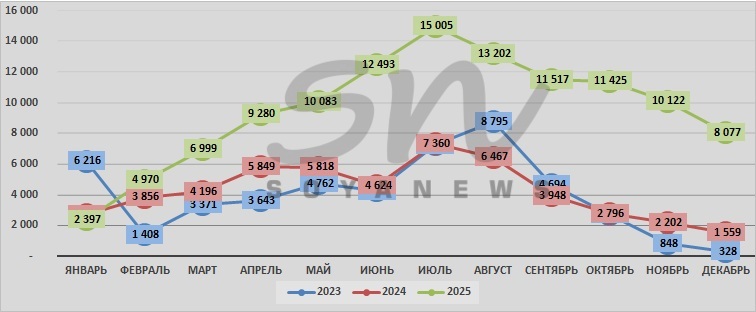 За период с января 2023г. максимальный объём производства комбикормов для рыб был достигнут в июле 2025г. (15 005 тонн), уточняет SoyaNews. Минимальным стал объём производства декабря 2023г. - 328 тонн.