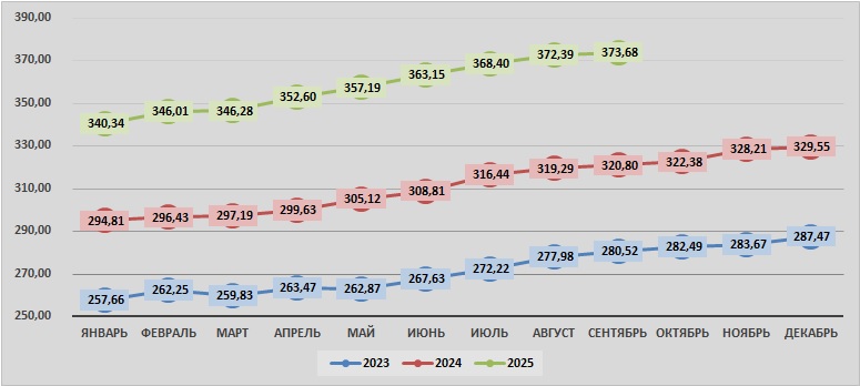 В сентябре 2025г. рыба в России* стоила в среднем 373,68 руб./кг - на 0,3% больше, чем месяцем ранее, и на 16,5% больше, чем в сентябре 2024 года. С начала года цена выросла на 9,8%.