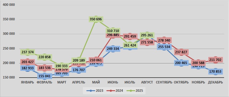 За период с января 2023г. минимальная цена на пресноводную рыбу в России зафиксирована в феврале 2023г. - 155,0 тыс.руб./т, отмечает AcNews; максимальной стала цена мая 2025г. - 350,7 тыс.руб./т.